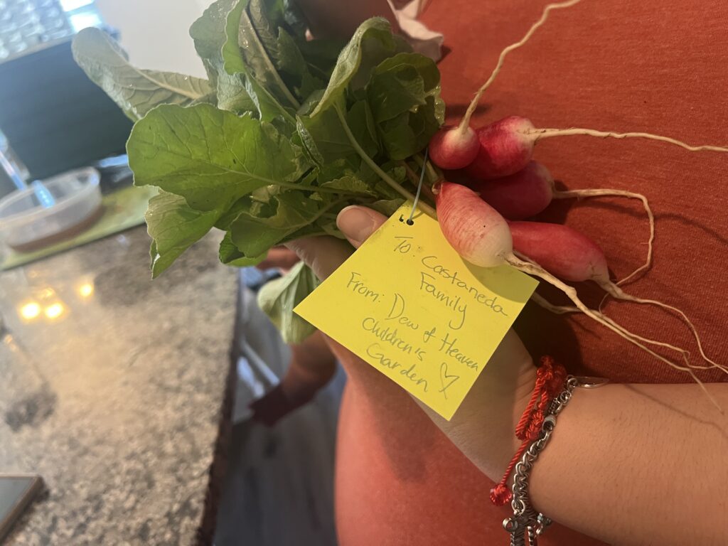 The garden’s harvest was intentionally put to use rather than treated as a display. Radishes were the first crop ready and became a highlight of early harvest days. One radish harvest was donated to a local family, who prepared and enjoyed them for dinner that same evening—an immediate and meaningful example of how small harvests can meet real needs.
