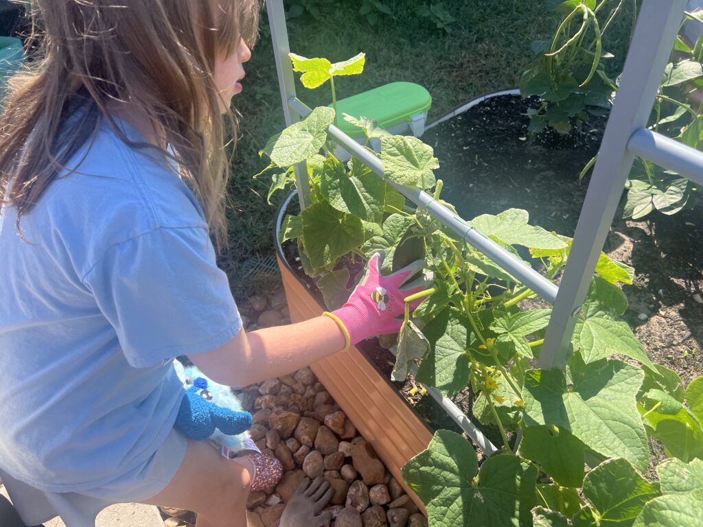 Each harvest day was an opportunity to pause, observe, and reflect. Participants carefully pulled radishes, clipped greens, and gathered cucumbers, learning when crops are ready and how to harvest in ways that protect future growth. Sampling was encouraged—participants tasted fresh produce straight from the garden and, when possible, took a portion home to share with their families.