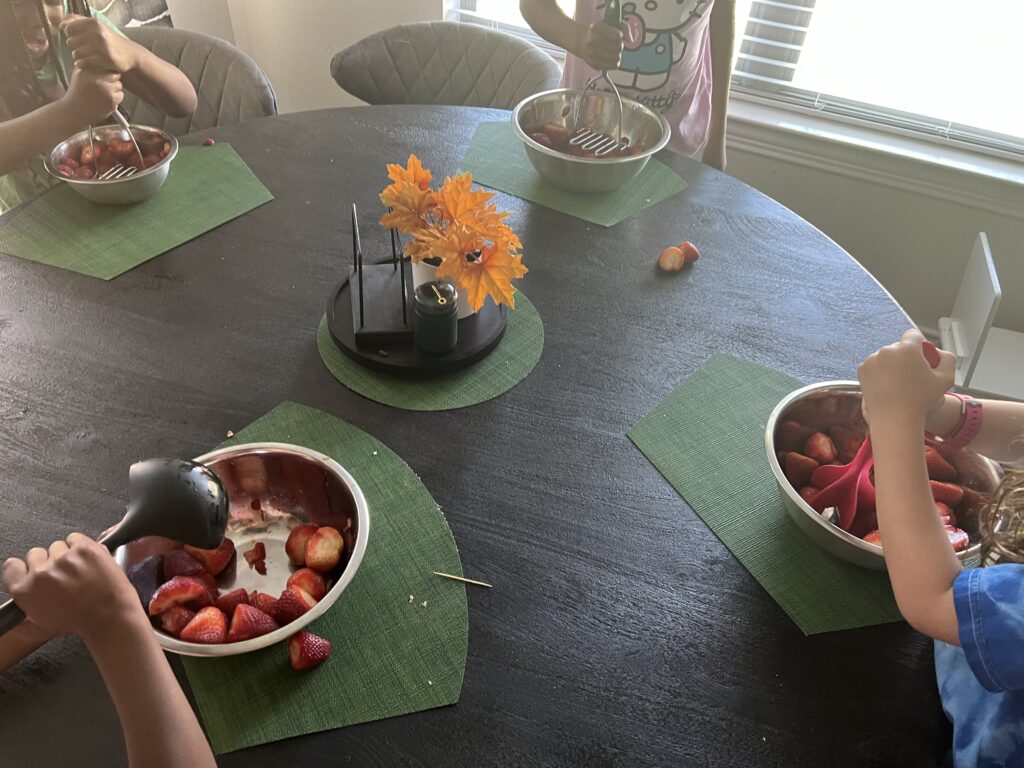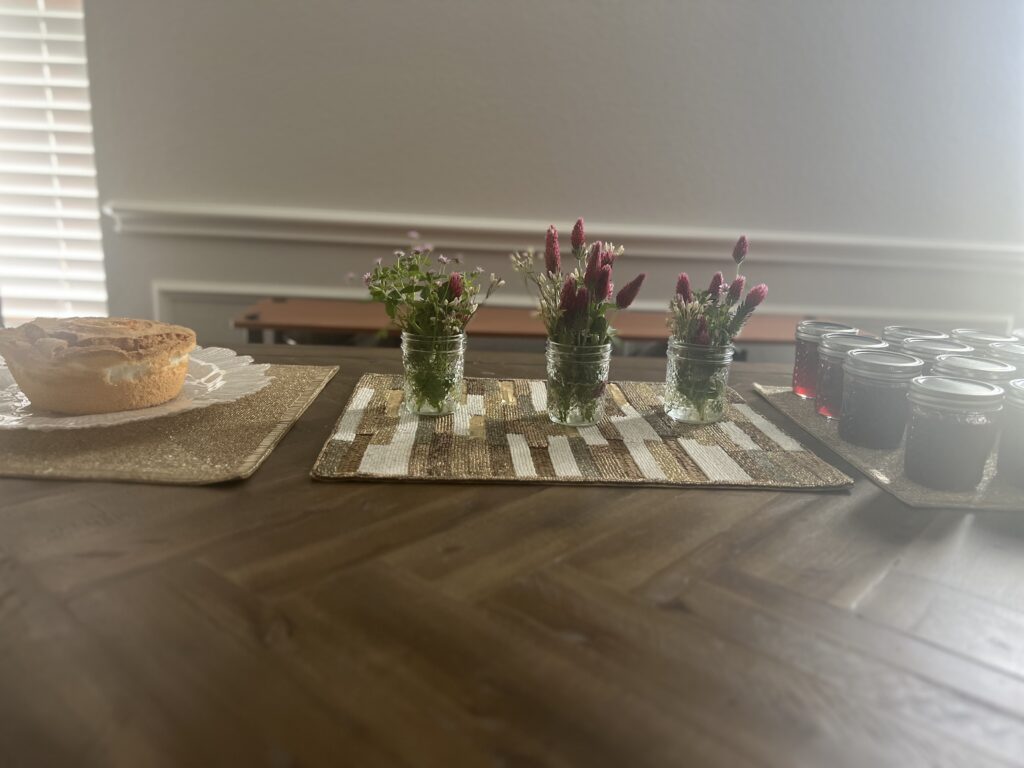 To close the activity, participants shared a previously prepared jar of strawberry jam served with angel food cake. One participant also selected seasonal flowers to set the table, reinforcing that food preparation includes presentation, care, and shared experience.