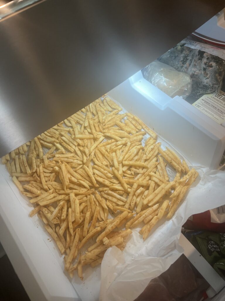 The instructor prepared the potatoes by cutting them into fry-shaped pieces, after which participants took the lead in seasoning. The fries were then laid flat and frozen to prevent clumping before being transferred into freezer bags for later use. This step-by-step process introduced participants to practical food preservation techniques while reinforcing the importance of preparation, organization, and proper storage.