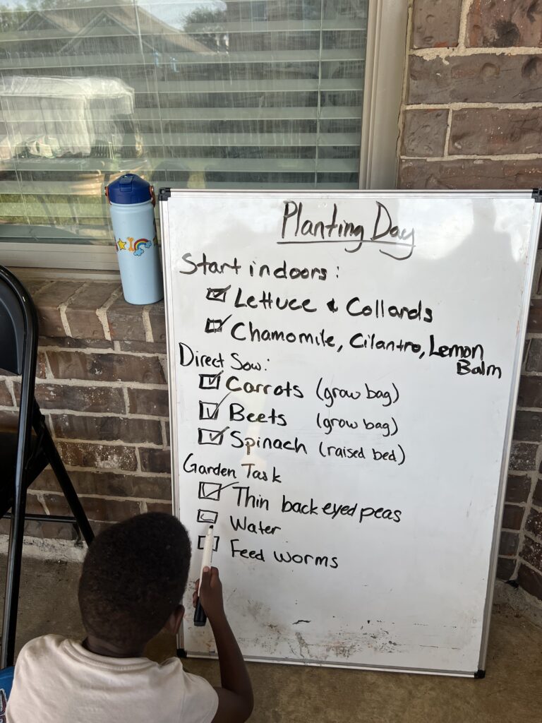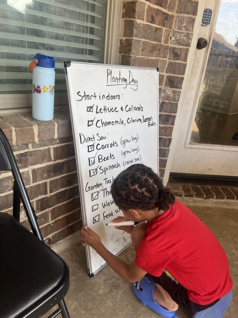 To support consistent care, a daily garden task checklist was developed and written on a whiteboard. Tasks included watering, observing plant growth, checking soil conditions, and general upkeep.